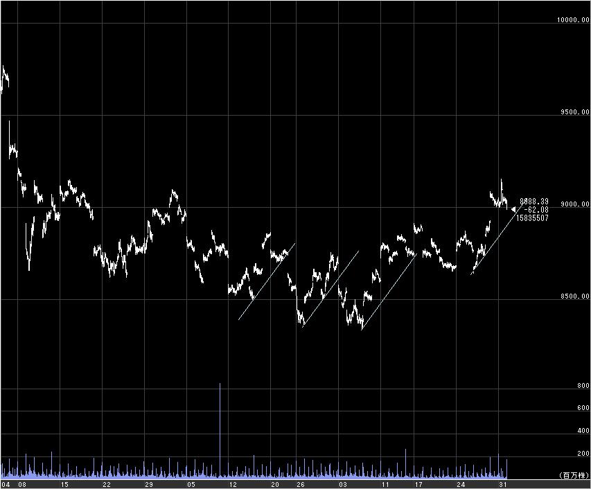 本日のトピックスは日銀介入による急激な円安。株価もそれにつれて一時、大幅に上昇したが後が続かずだらだらと下げ、長い上髭陰線となった。