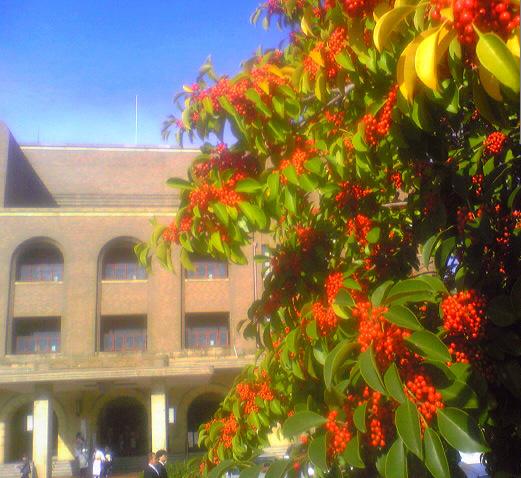 鶴舞公園の前にある名古屋市公会堂、昭和5年の古ぼけた建物ですが、いい味を出しています。周りにギンモクセイと良く似たヒイラギでしょうか?大きくなると葉も丸くなるようです。公会堂の正面では、クロガネモチの赤い実が綺麗になっていました。真っ赤に染まっていきます。