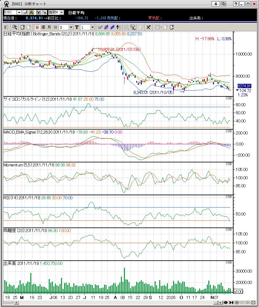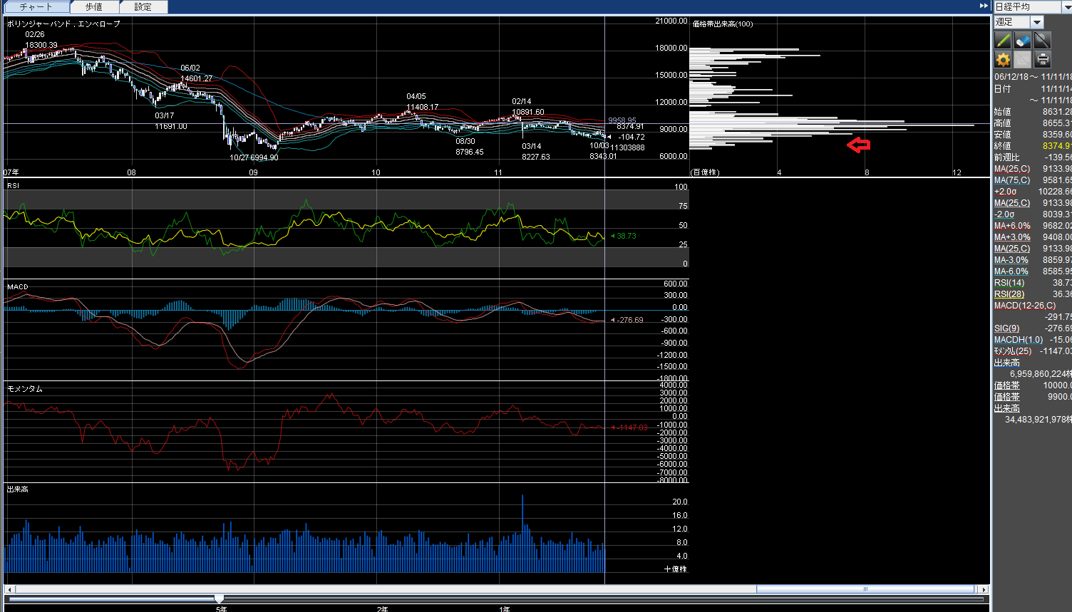 日経平均チャートがボリンジャーバンド-2ρの下限タッチ♪(((*゜ー゜)∧( ̄ロ ̄lll)エッ!!