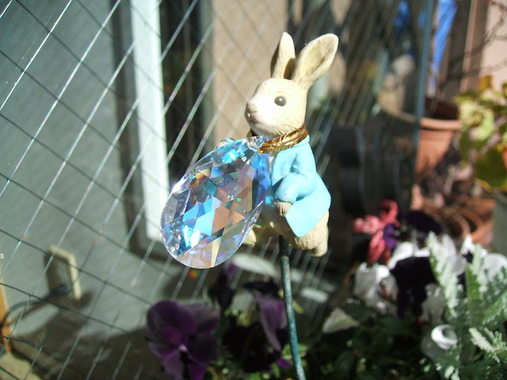 そのまましまいこんでいましたが、ハタと気づいてベランダの園芸用のピックのウサギさんの首につけてみました。