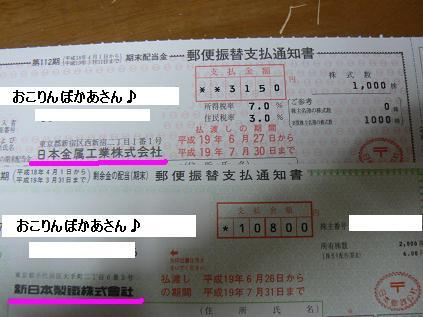 今日、日本金属工業から配当通知来ますた。ラッキ~、ラッキ~。