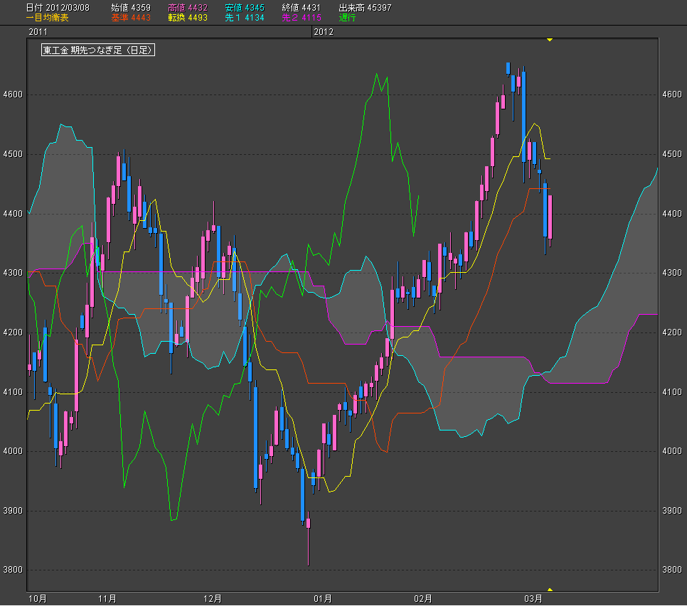 下記チャートは東京金日足の一目均衡表である。前日の急落から一転して本日(8日)値を切り返してきたが、果たして再度の上昇の始まりなのか?あるいは戻り高値の格好の売り場となるのか?その見極めは終値ベースで一目均衡の転換線をクリアーできるかが分岐点ではないか?