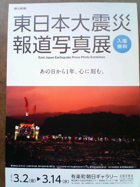 東証IRフェスタの合間を縫って「東日本大震災報道写真展」(有楽町朝日ギャラリー,有楽町マリオン11F,無料)へ。土曜昼間ということもあってか,さして広くない会場に次から次へと観覧者が訪れる。