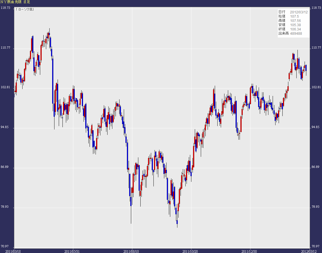 9日発表のNY原油(WTI)市場の取組内容は、投機玉のロングポジションは前週比2,093枚増の39万6,749枚と4週続けて増えたが、増加率の推移を見ると、4週前は前週比10.8%増、3週前は同5.2%増、2週前は同7.4%増と高い伸びを継続したが、今回は同0.5%増と微増に留まった。3月1日に、一時110.55ドルの高値を付けたが、110ドルは2月下旬に2日続けて押し戻された経緯があり、上値の壁として意識されている。投機筋は再び買い姿勢を強めて7日以降切り返しているが、終値ベースで110ドルを上回れば、その時は新規買いに弾みが付くと考えられる。