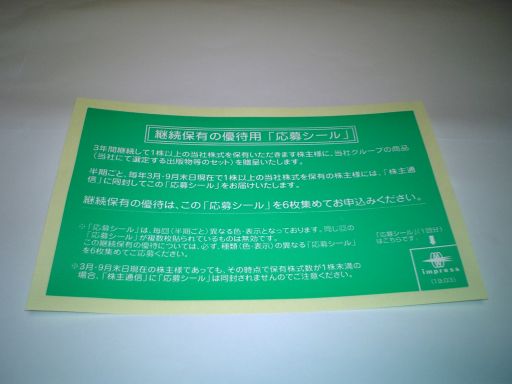 また3月末、9月末には写真のシールが配布されこのシールを6期(枚)(3年連続)で集めて送付するとインプレスグループの書籍セットがもらえるそうです。