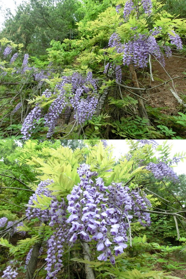 山藤が新緑の間に咲いていると、とても優しい色合いの差し色になっていますね。^^