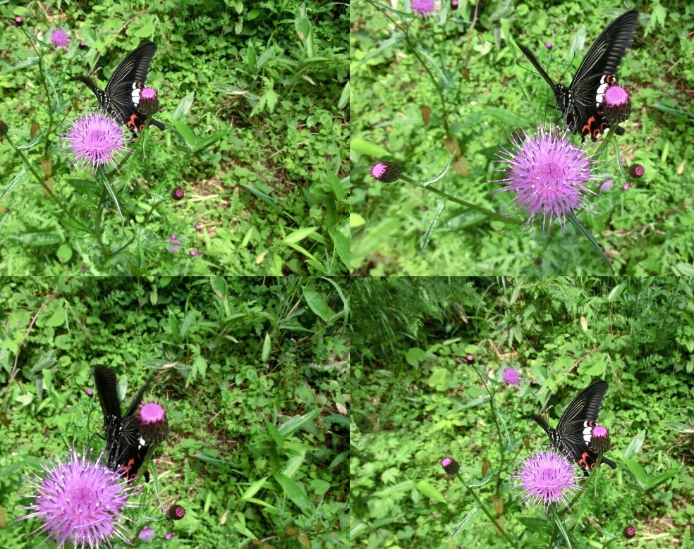 野アザミが咲きだしてアゲハ蝶がいそがしく吸蜜して回ってます