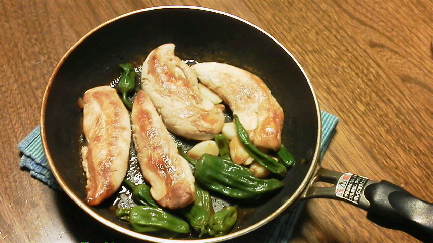 鶏の笹身とピーマン・シシトウの炒め物という何の変哲もない,と見受けられますが,このピーマンとシシトウ(どれがどちらかよく分からないのですが),監督(妻とも言う)の指揮下,私が畑に足を踏み入れて初めての収穫なのです。