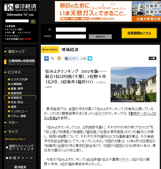 東洋経済社の発表した全国住み易さランキングでおらが街(福井県坂井市)が3位になりますた