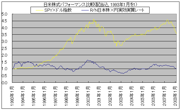 日本株価は、Russel/Nomura 日本株Total Market インデックス配当込に円の実効実質為替レートを乗じたものを使います。