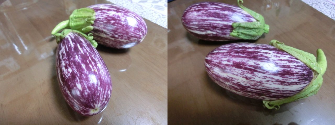見た目は紫のカスリ模様にヘタが妙にパステルグリーンで^^;