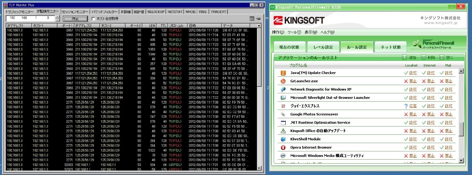 写真の右はPC用の無料ソフト みんかぶ推奨のキングソフトのインターネットセキュリティ2011版に含まれるファイヤーウォール で、PCがどこと通信してるかが判り、通信遮断や通信許可が管理できる優れたソフトです