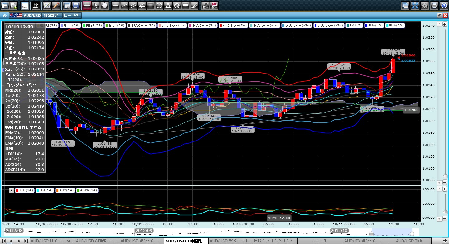 10/11。豪雇用統計がサプライズ。5000人増予想に対して約15000人増。失業率は予想5.3に対して5.4%。失業率の方を材料視するかと思いホールドしたがもみ合い後レンジを上抜け。