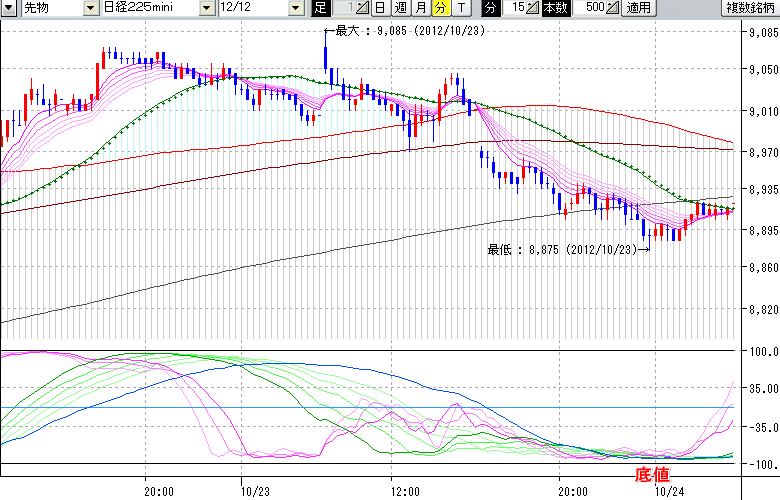 指標ラインの密集点が天底・転換点を示します。指標の見方