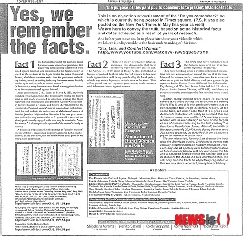 ”韓国の広報専門家ソ・ギョンドク教授と歌手キム・ジャンフンがニューヨークタイムズなど有力紙とタイムズスクエアの広告看板に出した「あなたは覚えていますか(Do You Remember?)」広告に、日本の狂信的極右派が反論する形式の「はい、私たちは事実を記憶している(Yes, We remember the facts)」という広告が、4日の米ニュージャージー州の地域紙スターレジャー(Star Ledger)に掲載されたと、韓国通信社ニューシスが9日報じた。
