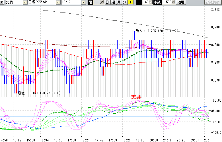 指標ラインの密集点が天底・転換点を示します。指標の見方