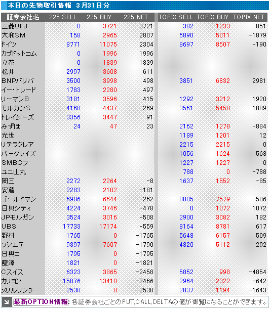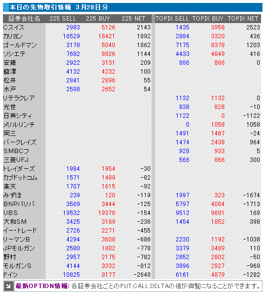 朝方発表された2月鉱工業生産速報が予想よりも良かったや先週末の強い流れを引き継いだことから、日経平均先物はCMEの終値よりも高く始まりましたが、前引けにかけて徐々に下げてゆき、後場に入ると下げ幅を拡大してきました。日経平均先物にでかい売りが続くので、また欧州系証券からの売りかなと思ったらやっぱりでした。クレディスイスやカリヨンの先物手口のパターンは、大きく買い越した翌日に大きく売り越し、またはその逆ってパターンが多いですね。