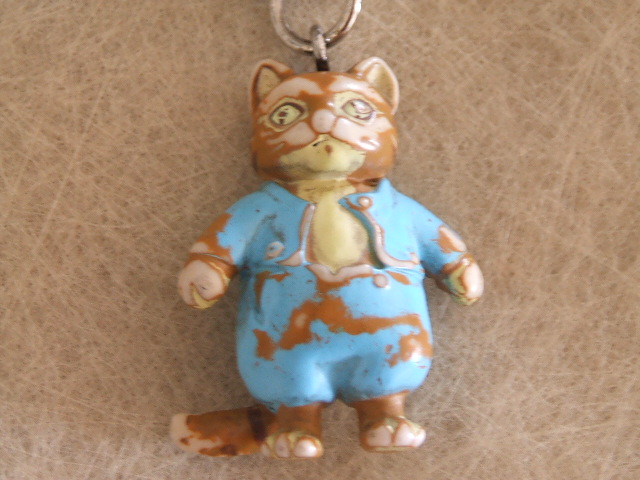 ピーターラビットのネコ版みたいな感じのネコちゃん。もう5年位前にいただいて、キーホルダーにずっとつけているので大分色がはげてしまいましたが、とても気に入っています。