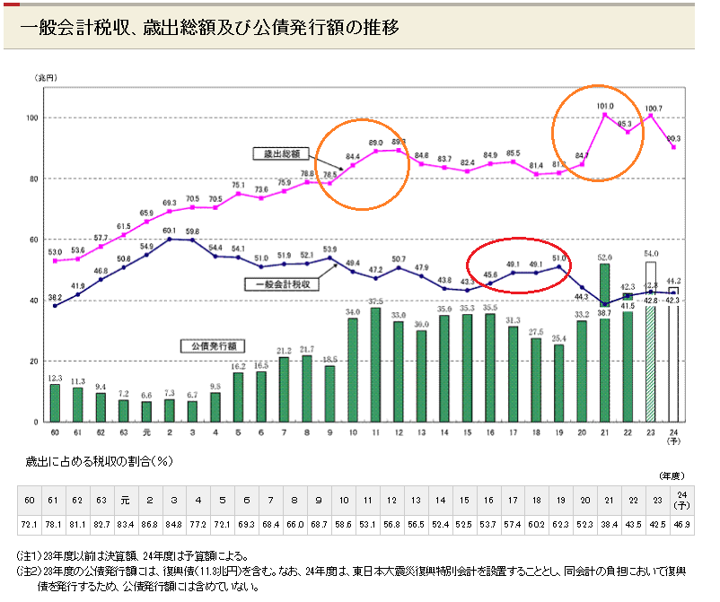 添付図(財務省より)ではバブル崩壊後、金融緩和不足でのデフレ化、円高進行、景気低迷で税収が減っている状況が良く分かります。 例外は、金融緩和を日銀にそれなりに行わせた小泉政権時代のみです。
