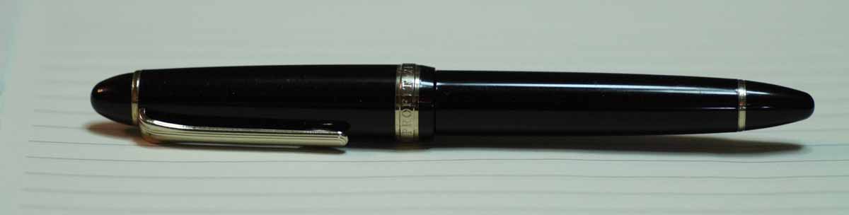 現行品に比べて外見の違いはキャップリングが大ぶりの一重。全般的に金メッキの色合いが薄いです。(後、首軸先端に金色のパーツが嵌っていたり、現行機種と違って14金のニブ(ペン先)に24金メッキは施されてないですね。しかし現行機種はニブが金なのに更に金メッキとか…)