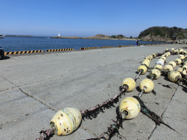 写真の左の大きい岩の向こうが漁港です