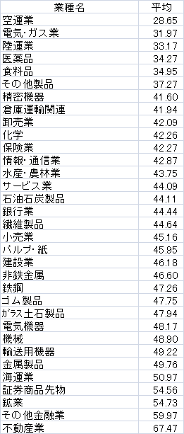 大事なのは値そのものではなく、業種ごとの比較です。値が小さいのが電気・ガス/陸運/食料品とかで、大きいのが海運/証券商品先物/その他金融/不動産と言われれば、なるほどと思われる方も多いのではないでしょうか。もちろん投資スタンスの違いによって、値動き小さい銘柄をじっくり行くか、大きい銘柄をリスク取って攻めるかはそれぞれの判断だとは思いますが、こんなデータを参考にして投資先を決めるのも悪くないと思います。