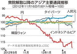 まず、グラフを見よう。衆院解散が決まった昨年11月16日の1ドル当たりの相場を100としてみたアジア各国の通貨の4月5日までの推移である。それまで独歩高だった円は下落に転じ、中国人民元を中に包み込むようにして小幅に変動する各通貨からどんどん遠ざかる。円相場は円高のピーク時に比べ25%も下がった。この各国通貨相場水準の円との乖離(かいり)こそが、過去にアジア通貨危機を招き寄せた大きな要因だった。