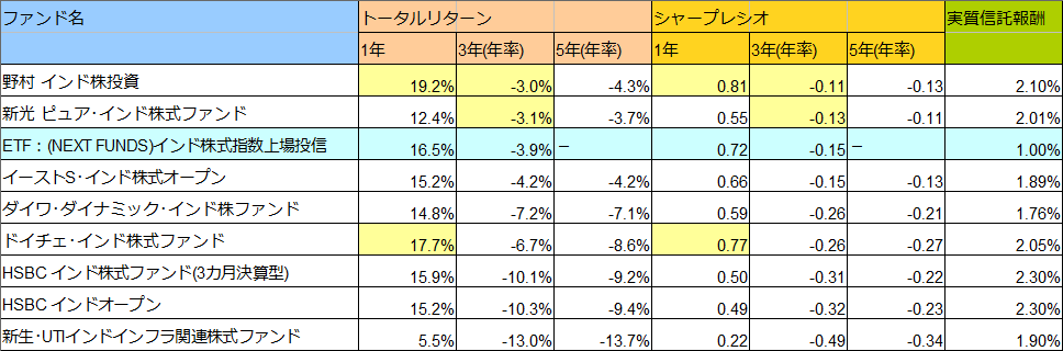 ETFは色を水色にして、ETFに勝った項目は黄色にしている。
