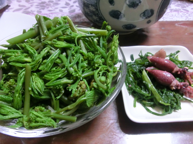 写真は今夜のおかずで、タチシオデの茹でたものとホタルイカとアサツキの酢味噌和えです