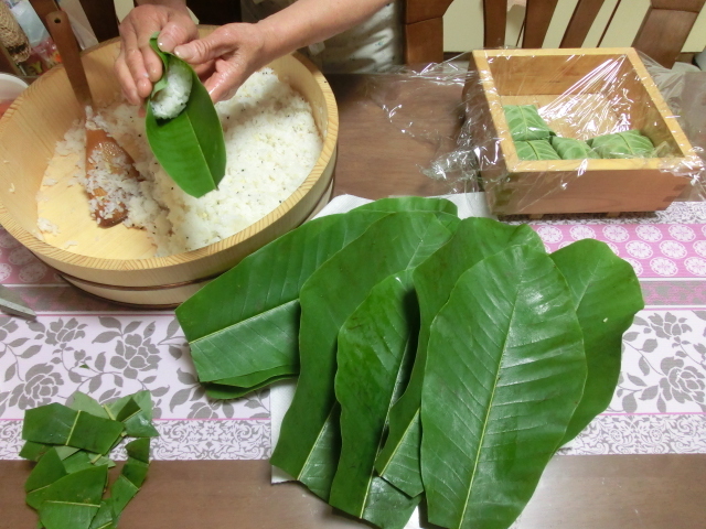 朴の葉を採集して持ち帰り、カアちゃんに寿司を作ってとお願いしました