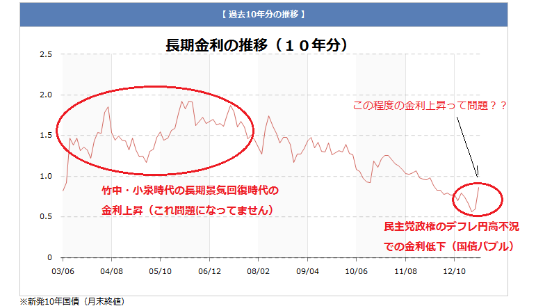最近の金利上昇は、昨年、民主党政権での異常円高政策での異常な金利落ち込み(国債バブル)からの戻しにすぎない。 それ以前の普通の金利に戻ってきただけ。 景気回復を感じて、国債に張り付いていた資金が株式や外債に向かったので、国債バブル崩壊=金利上昇となったのです。