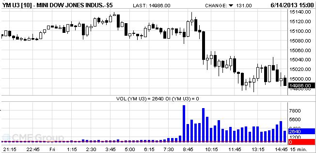 また、東京の日経平均に大きな影響を与えるとされるダウ平均のシカゴ先物価格は出来高が増え始めた現地時間で8:30頃に15,100ドル位、9:00頃は15,120ドル位でスタートし、終値は14,986ドルとなり、前日比で-131ドルの下落となったようです。