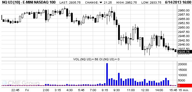 NASDAQのシカゴ先物価格は出来高が増え始めた現地時間で8:30頃に2,957.5ドル位、9:00頃は2,959ドル位でスタートし、終値は2,953.75ドルとなり、前日比で-21.25ドルの下落。