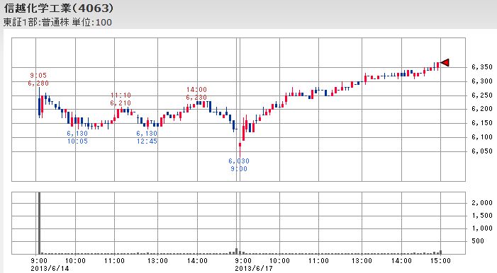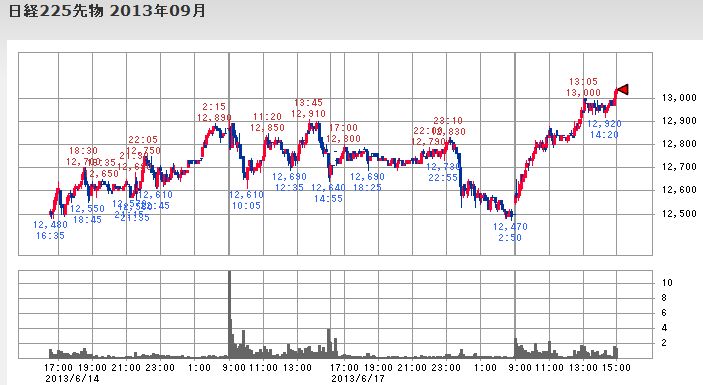 そして、売り方優位の日に良く見られる14時代後半での仕掛け的な売りによる株価の急落も本日は見られず、その時間帯に行われた13,000円台の攻防も買い方の仕掛けが有効に働き、あっさりと前日終値比300円を超える上昇と13,000円を突破する終値となっています。