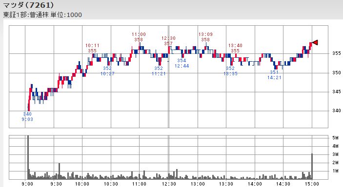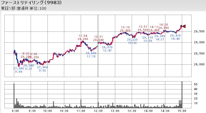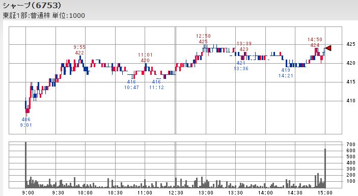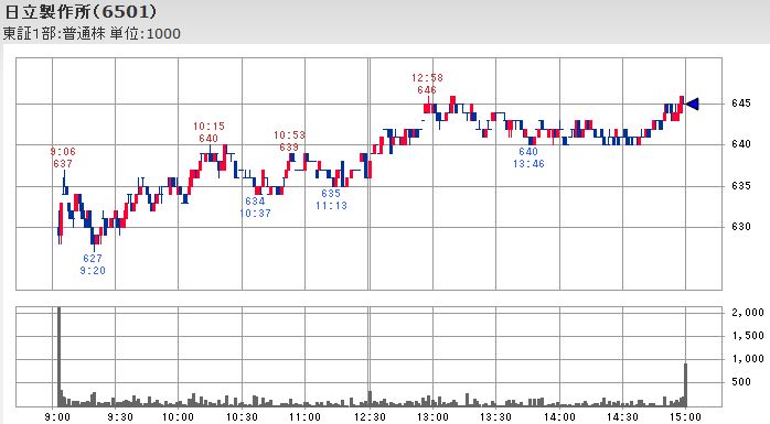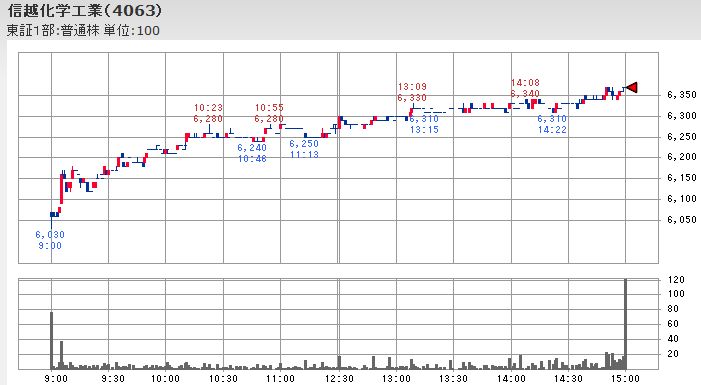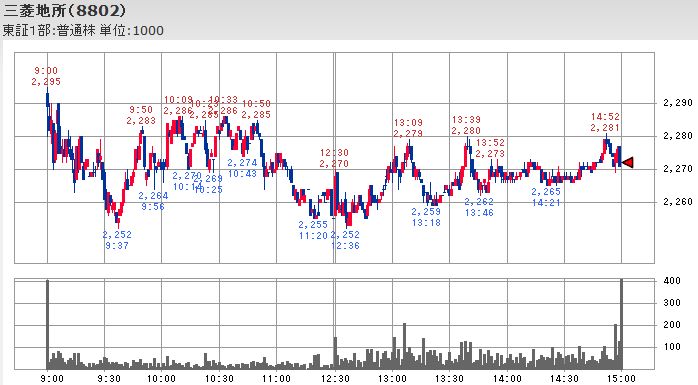 また、11:00頃の仕掛け的な買いと仕掛け的な売りが交錯した際には、V字型に反落させて売り方が買い方の買い上がりを一旦食い止めたように見えたものの、その直後の買い仕掛けで再び上昇へ転じるなど、基本的に買い方優位でザラ場の売買が進んでいます。