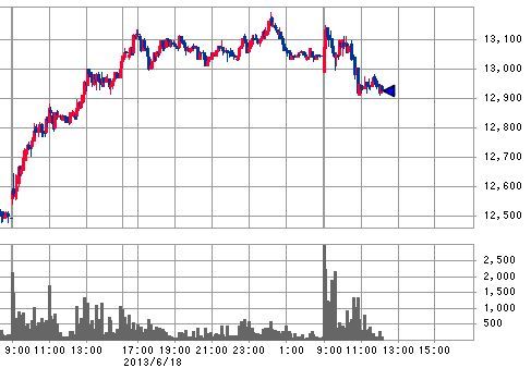 しかし、9時代前半は買い方の仕掛けと推測される出来高の増加を伴った上昇が見られますが、その後おおむね9:45頃までは売り方の仕掛けで下落した後、特に大きな仕掛けらしいものもないまま13,100円まで値を戻しています。