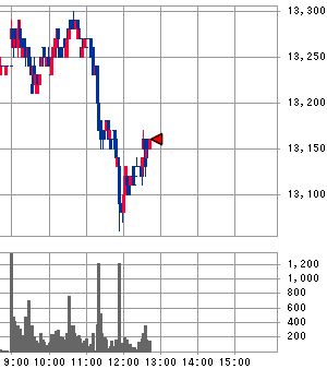 その後は買い方の反撃で13,120円近くまで戻したものの再び売り方に押し込まれて13,100円まで押し戻されるなど、東証の昼休み時間中にもかかわらず、先物取引では激しい攻防が続いています。