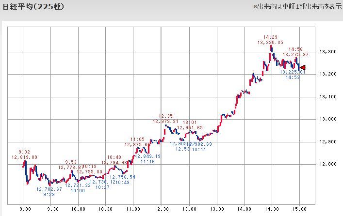 このような値戻しの広がりが進んだところに、13:30ころから4・5回ほど先物へ比較的大きな規模の仕掛け的な買いが入って14:29に13,330.35円へ急上昇させることに成功し、一気に前日比約300円の大幅上昇へ一気に形成を逆転したのです。