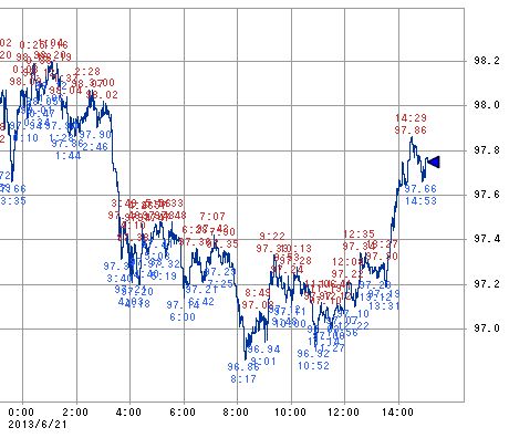 この様に平均株価への影響力が大きな銘柄が安定していたことに加え、トヨタ、ホンダなどの輸出関連の主力銘柄が安値付近で停滞していたとはいえ、ドル円相場が10:52に96.92円まで円高ドル安が進んだにも拘らずその影響による下落幅の拡大は見られませんでした。