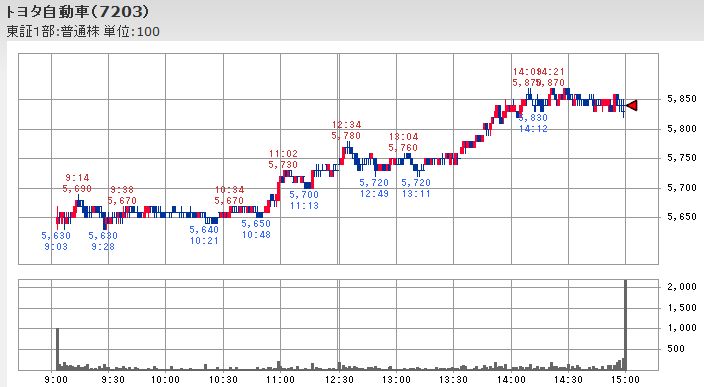 この仕掛け的な買いの際には先物買いの裁定取引で先物と連動して上昇する傾向にあるとされるファーストリテイリングやファナックではなく、同時並行して円高ドル安から円安ドル高へ戻し始めた為替との合わさって、日経平均寄与度が高く為替の影響を受け易いホンダを上昇させると共に、トヨタ、マツダ、日産自動車、富士重工といった自動車株が一斉に上昇に転じる形になっています。