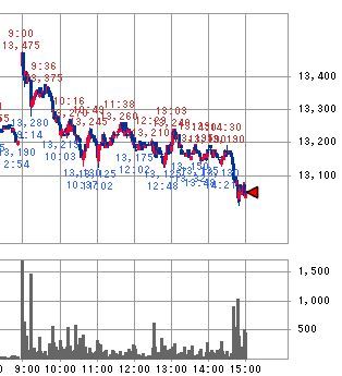 そして、日本時間10:00(シカゴ時間20:00)前後にシカゴダウ平均先物が14,650ドルへ急落したことを受けて、日経平均先物も13,130円へ急落してしまい、それに合せる形で日経平均も下落しています。