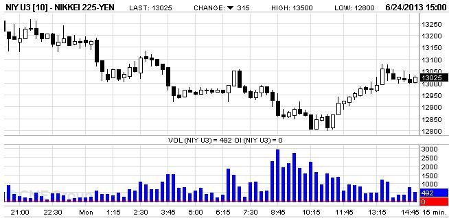 これを受けて戻った筈のシカゴ日経平均先物はシカゴ時間8:30(日本時間23:30)で12,950円からシカゴ時間15:00(日本時間5:00)で13,025円とダウ先物よりも大きく戻しているのですが、シカゴ時間8:30(日本時間23:30)のドル円が97.6円くらいで為替はほぼ同じなのに大きく戻しているのは、日本市場がNYよりも落ち着きがあると見られているのか、それとも明日のNYが反発することを先取りしているのか不明です。