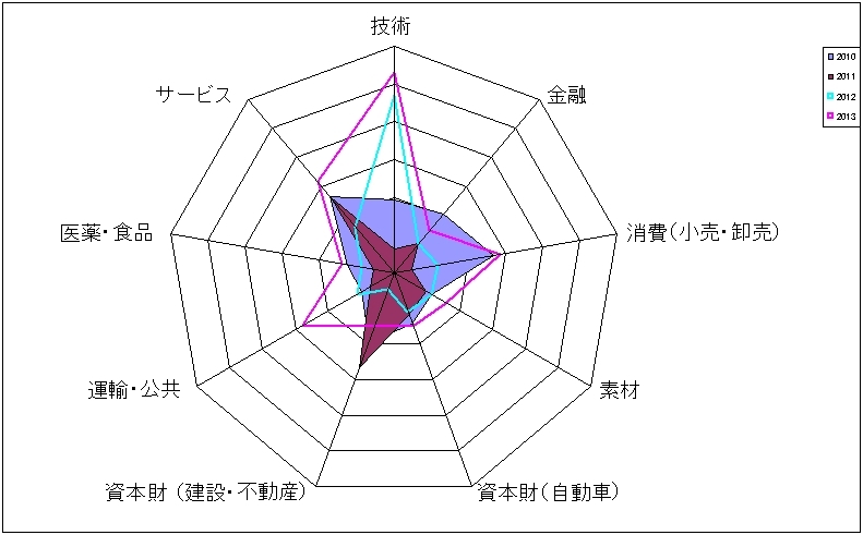 今回は、業種別で・・・ レーダーチャートを作ってみました。