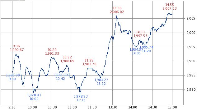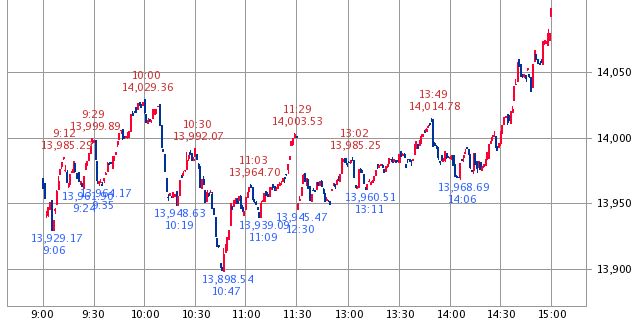 しかし、後場に入ってからは逆に13:30前後に99.55円から99.7円前後と14時台に99.65円から99.8円前後となった円安ドル高や、香港市場が13:14(日本時間14:14)前後から13:42(日本時間14:42)に、上海市場が13:12(日本時間14:12)前後から13:36(日本時間14:36)に、シカゴダウ平均先物が0:15(日本時間14:15)前後から1:00(日本時間15:00)に堅調に推移し始めたことを材料に売り仕掛けが入って上昇し、後場だけで13,945.47円から14,098.74円と約150円近く上昇して終えています。