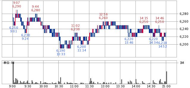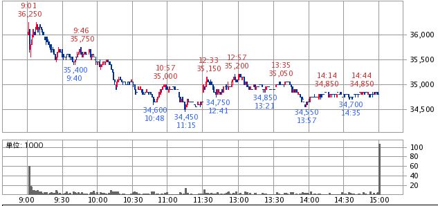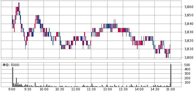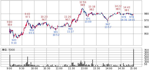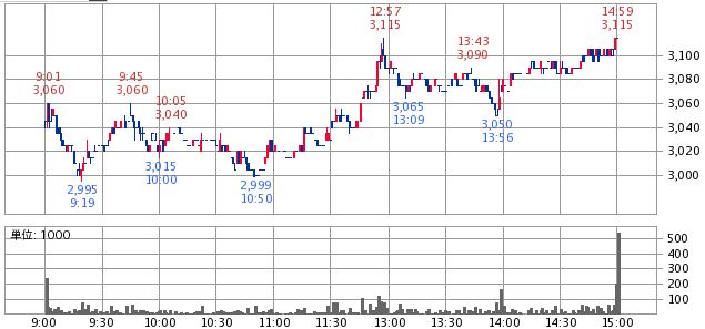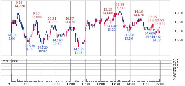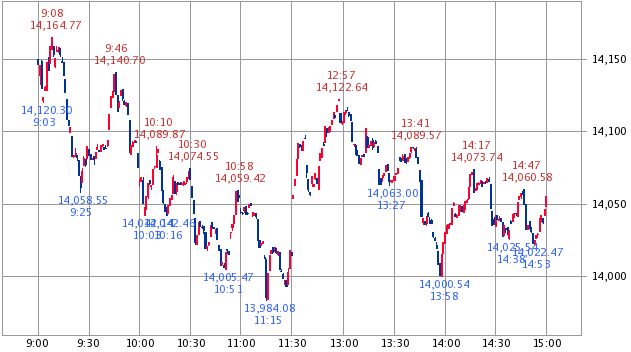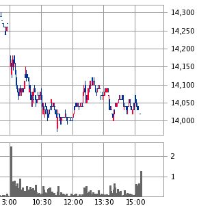 しかし、香港や上海の後場の軟調さへの警戒を材料に売り仕掛けが入って13:41の14,089.57円から13:58の14,000.54円と約90円近く下落し、その後は何度か上昇と下落を繰り返しながら14:53の14,022.47円から大引けで14,055.56円まで値を戻したものの前日比-43.18円(-0.31%)の反落となっています。