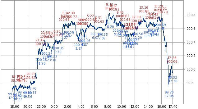 本日は東証の大引け後の16:01には1ドル100.79円前後から17:05には99.70円前後と急激に円高ドル安になり(もちろん円高ユーロ安も)、日経平均先物は東証の大引けの頃で14,020円だったのが16:30の13,930円から17:04には13,770円、TOPIX先物は東証の大引けの頃で1,173円だったのが16:30の1,165円から17:04には1,152円へと急激に下落しています。