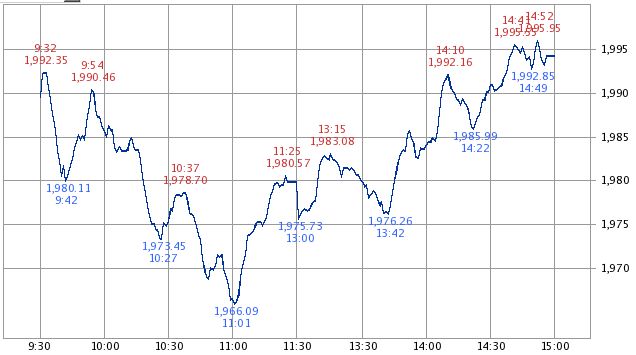 しかし、9:46に1ドル100.8円前後だった為替が10:50に1ドル100.4円へ円高ドル安となったことの影響や、香港や上海への警戒からか9:46の高値から100円近く下落して10:01に14,042.01円となり、さらに香港や上海の朝方の軟調さを材料に売り仕掛けが入って10:30の14,074.55円から10:51の14,005.47円と70円近く下落し、売り仕掛けが入ってから11:15に13,984.08円と再び70円近く下落しました。