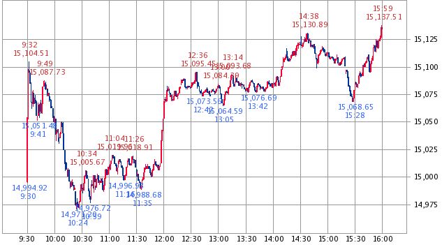 NYダウが15,135.84ドル(前日14,932.41ドル、前日比+147.29ドル)と上昇したのに、東証の終値より上昇したまま終えたようです。