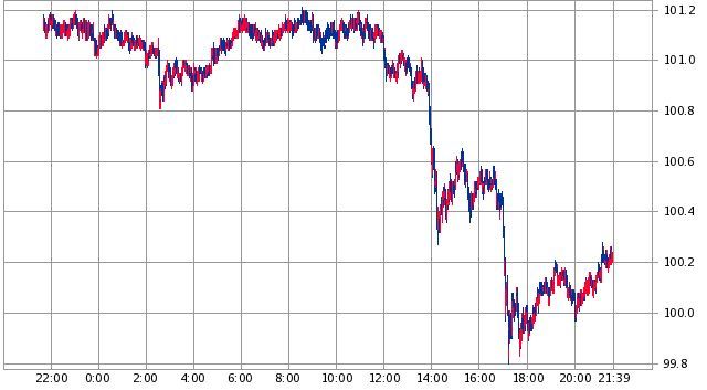 そうした香港や上海市場の好調さを材料に日経平均先物は東証大引け以降も堅調な相場が続いて上昇しましたが、16:35の14,440円から17:10の1ドル14,270円へ急落し、16:35の1ドル100.58円から17:13の1ドル99.80円へ約0.6円の円高ドル安になったのと並行する形となっており、円高株安が急速に進んでいました。