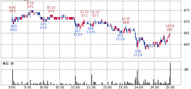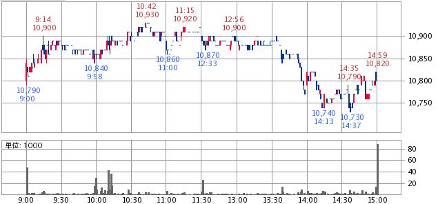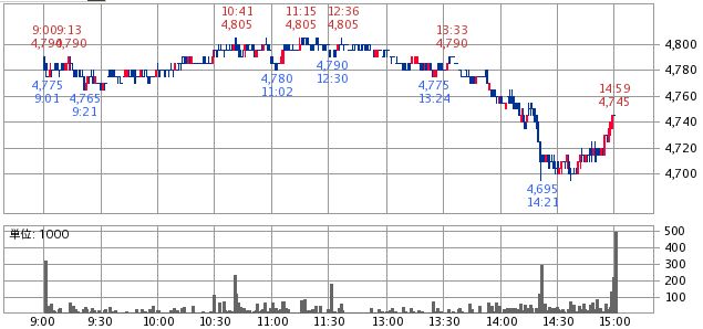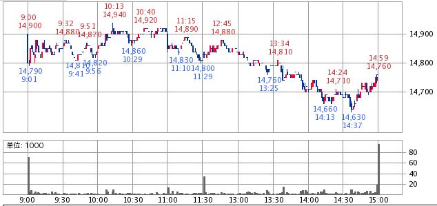後場の寄り付きもほぼ前場の引けと同じ水準となった為日本時間12:33(香港時間11:33)に香港のハンセン指数が21,786.88香港ドルと少し値を戻していたことから、14,472.34円とほぼ前日比横ばいになっていましたが、12:46に後場の最高値14,521.76円をつけています。